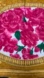 Stylish scarf with vibrant pink rose patterns with a gold frame on a navy floral textured background.