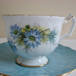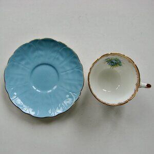 - beautiful blue floral teacup and saucer with a gold gilt trim along the edges and inside cup with a floral pattern on the outside and inside of the teacup