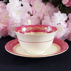 Vintage Aynsley (England) wide mouth tea cup and matching saucer. English bone china featuring purple-pink band with gold gilded leaf garland and floral center. Made in England