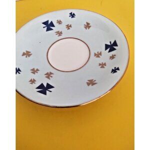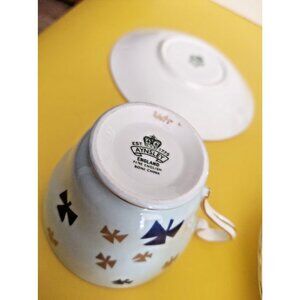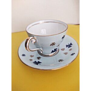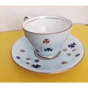 Vintage Aynsley Girl Guides Teacup and Saucer is a collectible, fine bone china set from England, featuring a rare robin's egg or powder blue color with scattered gold/dark blue trefoil emblems (Girl Guide symbols) and gold trim, produced by H. Aynsley and Co. in Stoke-on-Trent, England during the mid-20th century in the 1950s to commemorate the organization, making it a prized item for collectors and Guiding alumni