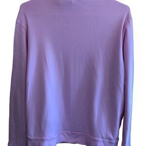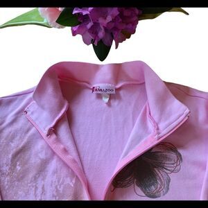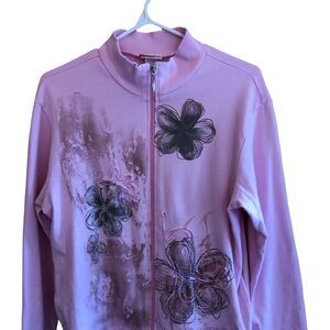 In excellent pre-owned condition this light cotton/Lycra blend jacket is a pretty light pink (see first 2 & 5th pictures). Size medium, lovely pattern with a bit of sparkle lower left side of jacket “Vancouver”. See measurements. No hood or thumbholes. Size tags missing.
