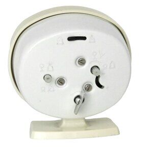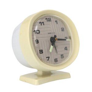 Vintage BABY BEN WestClox Wind UP Alarm Clock is a charming throwback to the Mid-Century Modern era. This delightful timepiece features glow-in-the-dark arms and a classic analog design in a cream colour that exudes retro charm. Perfect for bedside tables, this clock combines functionality with vintage aesthetics, making it a wonderful addition to any room.