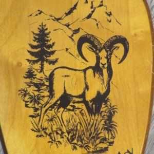 Vintage wooden plaque with bighorn sheep, from Banff Canada.