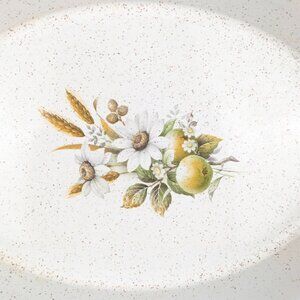 Sturdy speckled stoneware platter with a retro harvest floral design—features apples, daisies, wheat, and serious 1970s cottagecore vibes. Marked “BMP 630 Canada” on the base.