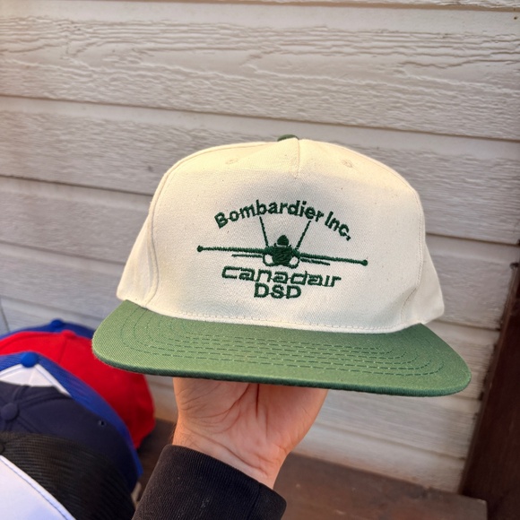 Vintage BOMBARDIER Canadair DSD fighter plane snapback hat adjustable green beig