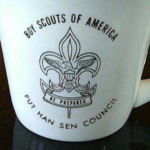 Vintage BSA Boy Scouts of America coffee mug with gold trim, featuring the Put Han Sen Council design. This unique and collectible mug is a perfect addition to any scouting memorabilia collection or a thoughtful gift for a Boy Scouts enthusiast. Made of durable pottery and glass, this mug is both decorative and functional, adding a touch of nostalgia to your morning coffee routine or tea time. Add a piece of history to your kitchen with this charming BSA coffee cup.