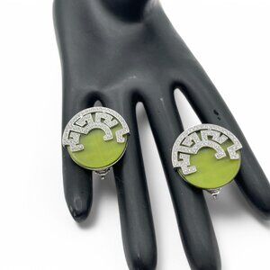 This set of clip on earrings by Butler are part of the 5th Avenue Collection and are a rare find! Each large earring is set in silver tone and begins with a jade glass background. The next layer is a gorgeous pave rhinestone pattern. The clips also offer adjustable tension.