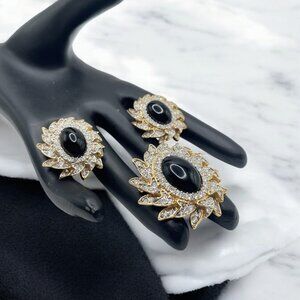 Vintage BUTLER Faux Onyx Brooch and Clip On Earrings Demi-Parure Rhinestone Set