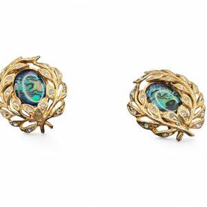 This set of clip on earrings by Butler are the perfect find! Each large earring is set in gold tone. A rhinestone decorated wreath shapes the earring and the middle is a beautiful abalone.