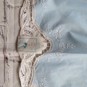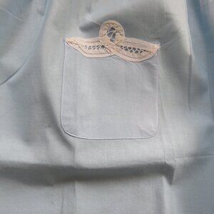 Beautiful new vintage baby blue half apron bordered with white cotton lace and applique. Never used still has one of the original tags still on it.