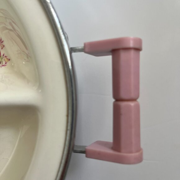 Vintage Baby Dish. Warm water is put in the hole and it warms the food in the dish. This dish is metal on the bottom and ceramic on the top. Decorated in the theme of Mary Mary Quite Contrary Nursery Rhyme. This dish would make a very nice decor item for the home with a new baby.