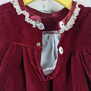 A deep red velvet with full skirt, ribbon and lace trim with two adorable bows.