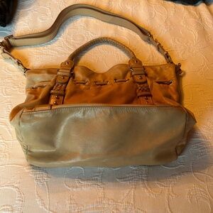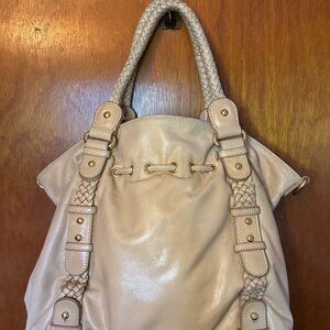 Nude leather satchel by Badgley Mischka. Braided handles and lots of fun gold-tone hardware. Good to fair used condition. Some marks and wear as pictured. Same bag on Poshmark US is listed for $120 US, mine has a shoulder strap but is not in like new condition, price reflects this.