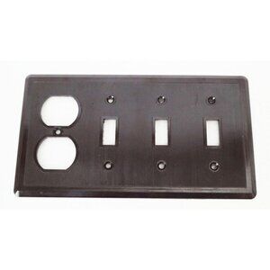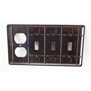For your consideration is a vintage Bakelite wall plate with three toggle switch slots and a duplex outlet opening. The plate has a ribbed texture and screw holes for installation. Screws not included.