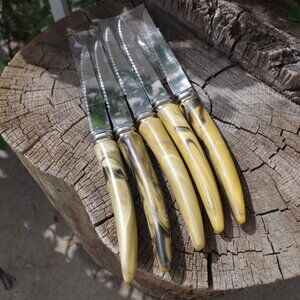 Vintage Bakelite steak knives ,five with great marble color. Made in ShefField England