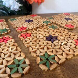 Each piece is crafted from natural bamboo and hand-dyed wood beads, forming delightful floral patterns. These trivets are lightweight, durable, and radiate retro warmth. A perfect nod to mid-century and global-inspired design!