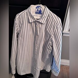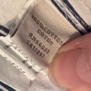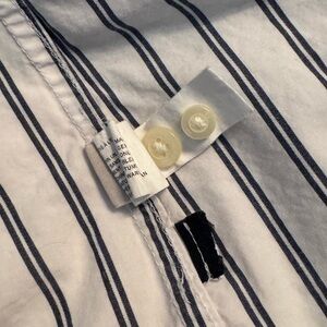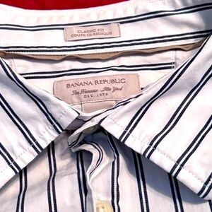 👔 Classic and timeless, this vintage Banana Republic men’s dress shirt is made from 100% cotton for comfort and breathability. Features a crisp white base with vertical navy pinstripes, button front closure, and a pointed collar. Perfect for both business casual wear or a relaxed, polished weekend look.