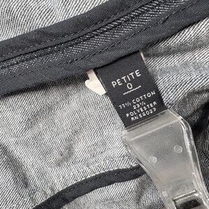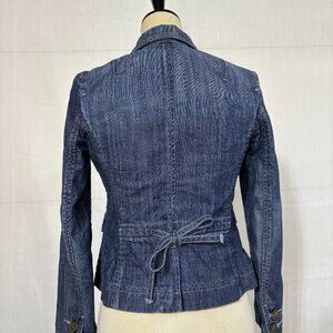 Women’s denim jacket by Banana Republic, size Petite 0 (fits like XS). Classic tailored fit with adjustable waist tie, vintage-style buttons, and flap pockets. Fabric: 77% cotton, 23% polyester.