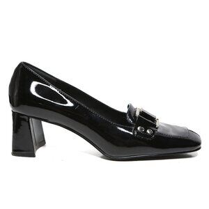 The Vintage Bandolino Patent Leather Loafer Pumps are stylish and practical shoes that every fashion lover should consider. They feature a square toe design that adds a modern touch to the classic loafer style. The chunky wide-shaped heel offers comfort and stability, making them great for all-day wear. With a glossy black upper and a shiny silver buckle at the toe, these pumps are perfect for both casual and dressy occasions. They combine comfort and style effortlessly, making them a versatile addition to your wardrobe.