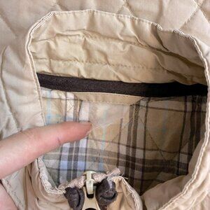 The front and one on the back, they’re from bug spray. If you know how to remove those, my loss is your gain. Other than that it’s in great condition. Minor Wash wear. Full front zip. Tags are unreadable, size L chosen based on fit and measurements in pics.