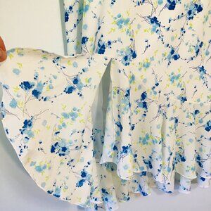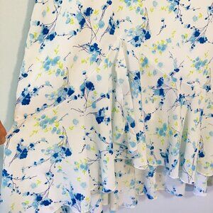 Lightweight skirt in a beautiful blue floral pattern with a ruffled hemline in a mermaid style. Partially lined with rear zip closure.