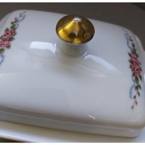 Vintage Bareuther Waldsassen Bavaria Butter Dish with Lid, Made in Germany, Pink Flowers and Gold Trim. In great condition for its age!. There are no chips or cracks or crazing. The gold knob part on the top of lid has some natural wear. The gold trim around the dish is in great condition. The floral design on top is in great condition as well.