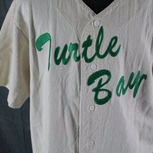 Up for sale is a vintage baseball jersey. It has a cream base colour with Turtle Bay in green script crested on the chest. The back of the jersey has a graphic of a sea turtle with Turtle Bay Pub underneath. What a great shirt do not miss out on it.