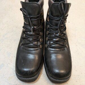 Waterproof leather boots, hand made in Canada. Size 7-1/2 to 8 (depending on socks). Wool shearling lined, insulated footbed. Thick out sole for extra insulation. Nice brass detailing for laces. Stylish warm dry boots in very nice shape (few scuff marks as shown in photos.)