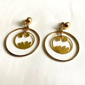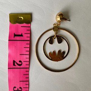 Vintage gold-tone drop hoop earrings with Batman logo. From the 1990's. Bold statement piece for Batman fans.