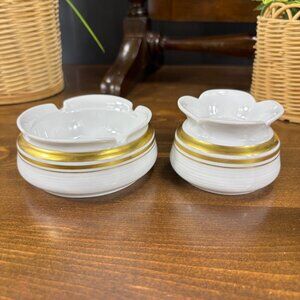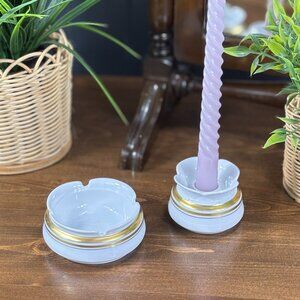 Timeless elegance from Bavaria: this vintage mid-century Tirschenreuth porcelain set includes a floral-shaped candle holder and coordinating round trinket dish. Both pieces, made in Germany circa 1950s–1970s, feature a crisp white glaze and hand-painted gold bands—perfect for vanity decor, ring storage, or tabletop ambiance. Though the dish was likely an ashtray originally (doesn't appear to be used that way), it now makes a beautiful catchall or jewelry dish.