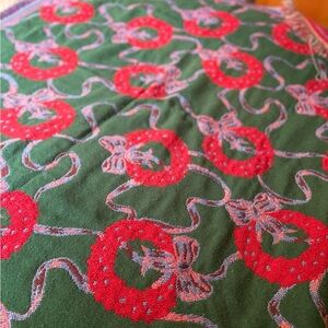 Vibrant textile with intricate red and green patterns. Ideal for cozy decor.