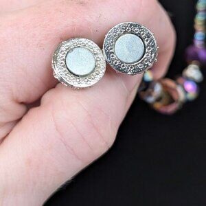 This vintage necklace is beaded and has a spherical magnetic clasp covered in small white rhinestones. I'm not sure if the clasp is meant to be worn at the front or back, but it looks nice either way. The necklace features faceted crystal beads with AB (aurora borealis) coating, giving them that beautiful multicolour look. There are small spacer beads between the larger beads, and sections where there are no larger beads at all. The necklace has normal wear but is in good condition overall. Worth noting, this necklace belonged to my late grandmother and sat in her jewellery box for years, so despite having washed it, it might still smell a little bit like grandma's jewellery box.
