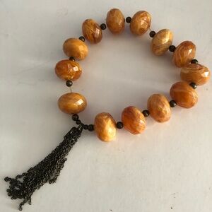 Elegant bracelet with orange beads. Features a stylish tassel. Perfect for any occasion. Lovely butterscotch like beads with gunmetal chains , used but in good shape bracelet is threaded with an elastic . Check pics