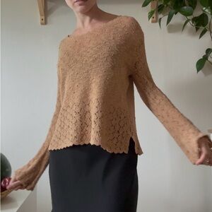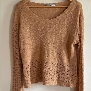 Delicate and romantic, this vintage knit sweater features golden beaded details, elegant bell sleeves, and a soft scalloped neckline and hem. Perfect layered over slip dresses or styled with jeans for a cozy, ethereal look.