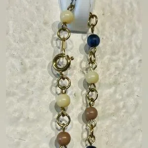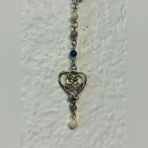 This elegant necklace features a stunning heart pendant, perfect for adding a touch of sophistication to any outfit. The delicate chain is adorned with beads in shades of blue, cream, and brown, creating a versatile and stylish accessory.