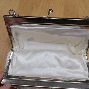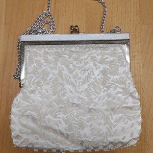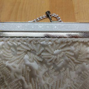 Ivory coloured Beaded Purse with an enameled white and silver opening.