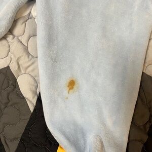 Vintage Beatrix Potter Velvet two piece footy pajamas. Cream and light blue with embroidered Peter rabbit. Staining on it but still a collectors piece can be dry cleaned.
