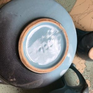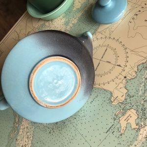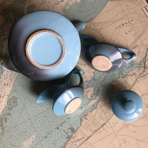 Great retro teapot with matching cream and sugar set. Lovely subtle wave detail with speckled purple/ almost black wash. Marked 706 on bottom, no other markings I can find. Crazing, some pits on teapot lid and bottom of creamer - still very nice set. Teapot measures approximately 11.5" long with spout and handle, 8" wide, 5.5" tall.
