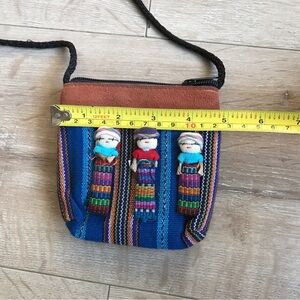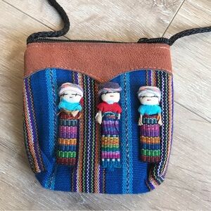 Adorable cross body sling purse with woven fabric and handmade worry dolls .