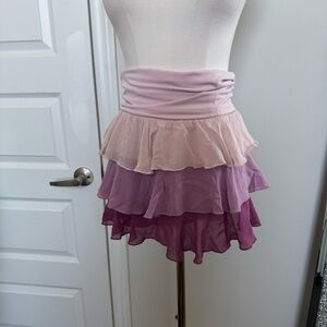 Dreamy and romantic micro mini skirt featuring three cascading tiers of chiffon ruffles in soft ombré shades of blush, lilac, and plum. Wide ruched waistband for a flattering, ballet-inspired silhouette.
