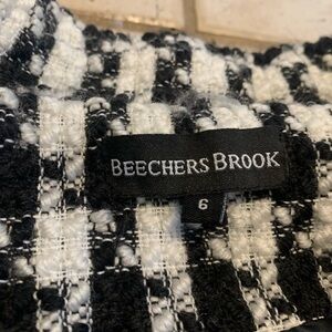 Chic and classic black and white tweed jacket from Beechers Brook. This stylish cropped jacket features a timeless houndstooth or checkerboard pattern, perfect for adding a touch of sophistication to any outfit. It has a slightly frayed hem and cuffs, giving it a modern, edgy twist. The jacket is a size 6 and is in excellent pre-loved condition. It's a versatile piece that can be dressed up for a night out or paired with jeans for a more casual look. A must-have for your fall and winter wardrobe!