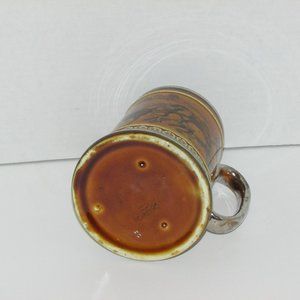 Tan beer mug with stage coach, horses and people. Two different scenes on front and back. Stamped but very faint.