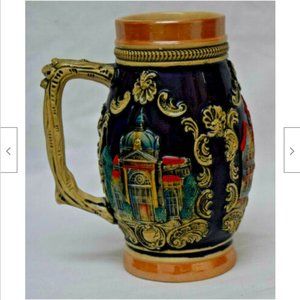 Vintage Ceramic Beer Stein with raised design, showing scenes from Weisbaden Germany, specifically the Kurhaus.