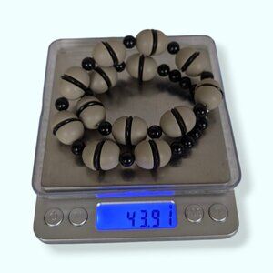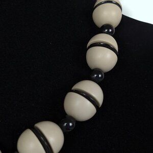 This vintage necklace is beaded and has a c clasp closure made of a gold tone metal. The necklace is beaded with beige and black lucite beads in such a way that reminds me of little hamburgers or Kinder Surprise eggs. The beads are smooth and seamless, and a little heavier overall than they look. There are spherical black beads acting as spacers, as well as disc-like black beads between the flat sides of the beige beads, it might be hard to see on the bust. There is normal wear, but there are no issues affecting wearability.