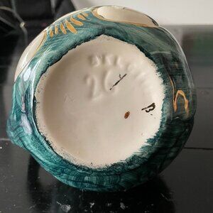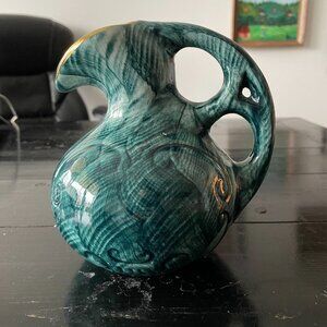 Vintage Belgium Ceramic Jug Pitcher hand painted with a peacock design. This charming water jug, standing at 16 cm tall, exudes a Colonial style with its glossy green finish. Made of earthenware in the 1950s, this decorative piece adds a touch of elegance to any kitchen or dining room. The capacity of 2 cups makes it practical for serving beverages while its embossed backstamp adds a unique touch of authenticity. A perfect addition to any vintage collector's home.