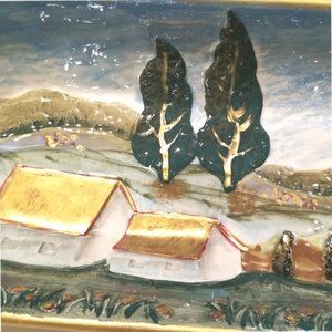 This is beautiful hand painted farm landscape boat shape tray. the color is very bright and vivid. blue sky ,white house and green field.and the .hill .\