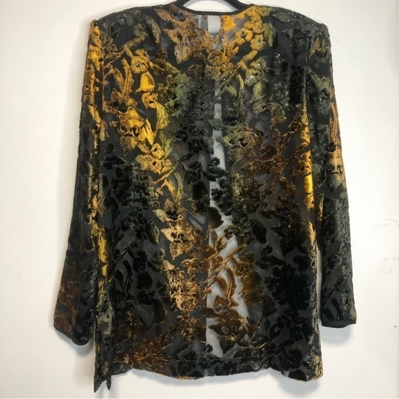 Step out in style with this vintage, Canadian made metallic velvet semi sheer cardigan.