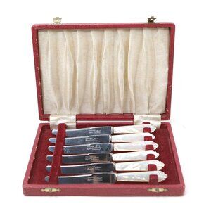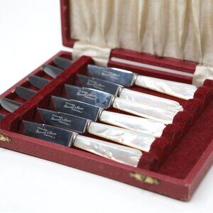 This is an exquisite, full set of six (6) vintage English dessert knives, crafted by the renowned Bennett & Heron of Sheffield, England. This elegant cutlery set features beautiful Mother-of-Pearl (MOP) handles adding a touch of classic luxury.
