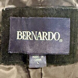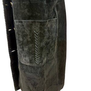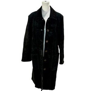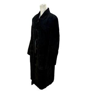 Sophisticated vintage genuine suede coat by Bernardo, designed in a timeless long silhouette. Crafted from soft black suede-textured leather with detailed whipstitch accents, button-down front, and practical patch pockets. A versatile outerwear piece that pairs effortlessly with both casual and dressy looks.