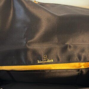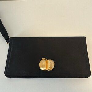 Vintage Bienen Davis black satin clutch/wristlet purse with goldtone 3D Apple detail & hand strap